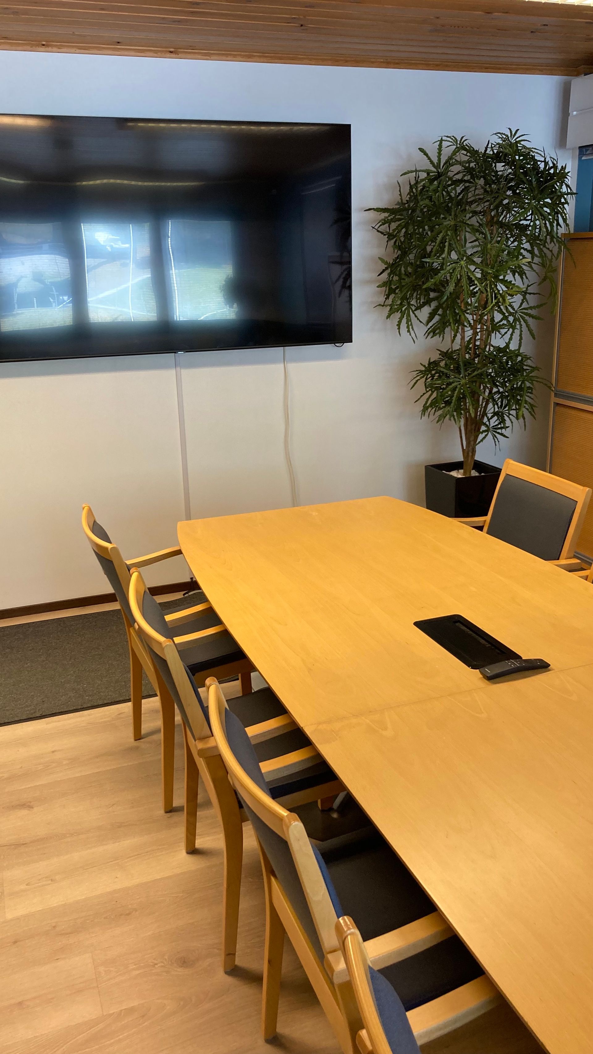 Tällä kertaa upotettiin asiakkaan kaapelit kaivoon. Kaapelikaivosta löytyy suoraan liitäntä näyttökaapelille, sähköt ja lataus älylaitteille. Kun kaivo ei ole käytössä on pinta huomaamaton ja siisti. Tarpeen tullen taas kannettavan liittäminen on nopsa ja varma operaatio.
